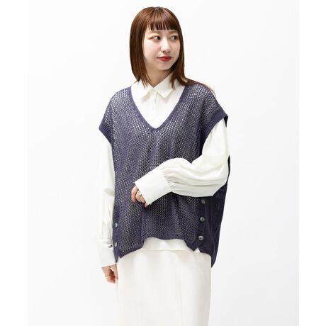 ◆メッシュ編みがこれからの季節にぴったりなベスト ◆深めのVネックでフェミニンな印象になるメッシュベスト。前後で着丈の差寸がついていて裾からトップスを覗かせるだけで旬な着こなしが叶います。さらにサイドの斜め切替やボタン使いがアクセントになり 細見え効果が期待できます。ナチュラルな表面が特徴のスラブ混ニットは上品な透け感も魅力の一つ!様々なアイテムと合わせてお楽しみ下さい。《お取り扱いについて》・着用またはお取り扱いの際は、アテンションタグや洗濯ネームを必ずご確認ください。《注意事項》※商品の色や質感をできるだけ忠実に再現するよう心がけていますが、撮影場所やお使いのモニター環境により、実物と若干異なる場合がございます。予めご了承ください。※写真を許可無くコピー・転用することは固くお断りします。