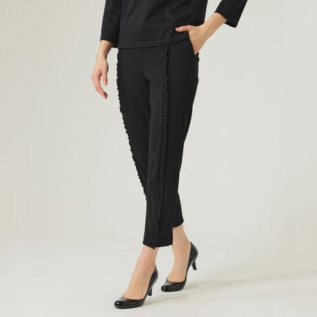 ジョーゼットのようなジャージー素材でおつくりしたシワになりにくくストレッチ性のあるレギパンです。センターにフリルのデザインで程よく脚のラインが協調されて足が長く見えます。デザイン性の高い主役級のレギパンなので、シンプルなトップスに合わせてお楽しみください。