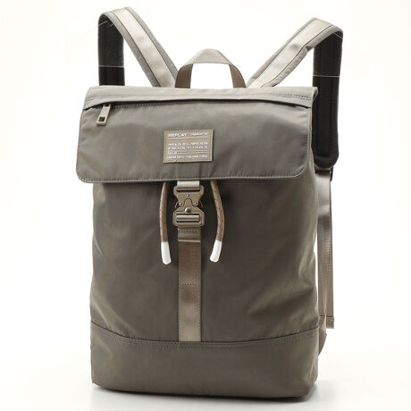 シックなナイロンとグログランテープのコントラストのフラップ付きバックパック。ファスナーポケットとロゴネーム付きのプラップはカチッとイージーな開閉が可能なメタルベルト。トップはドローコードによるによる開閉。通気性の良いエアメッシュのバックパネルとショルダーハーネス。L 32×H 44×D 13センチメートル