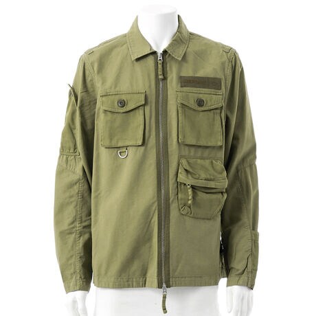 [型番:M4103 84506G]ボックスのフラップポケットエポーレットベルトなどミリタリーテイスト溢れるディテールを備えたシャツジャケット、フロントはダブルジップ、袖口はスナップ仕様、製品染めで風合いを高めました。リラックスフィット