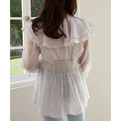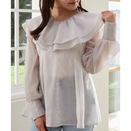 繊細なプリントとスイートなフリルデザインがドラマティックなムードを演出するブラウス。