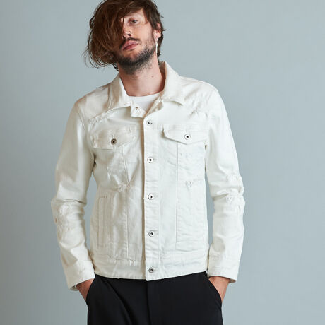 伸縮性の強いストレッチデニムをベースに激しいクラッシュ加工とペイントを施しグランジロックを彷彿とさせるブルゾン。