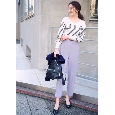 ・フロントウエストに芯を入れ、バックゴム仕様にすることで、リラクシーな履き心地ながらキレイ見えが叶います。