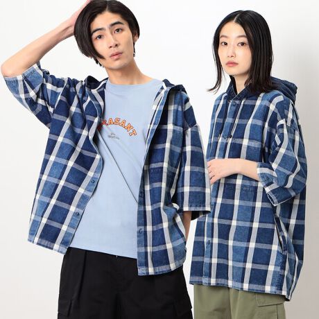 インディゴチェック 裏毛フード付き 半袖シャツ