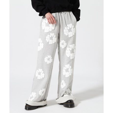 READYMADEとDENIM TEARSによるコラボレーションアイテム。スウエットのボディにDENIM TEARSのアイコンでもあるフラワーリースを全面にプリントしたスウェットパンツ。フレアシルエットで足のラインをきれいに見せてくれます。READYMADE / レディーメイドブランドネームであるREADYMADEには既製品に対してのアンチテーゼが込められている。本来、不要なものとして廃棄されていくようなものを循環させ、新たな姿に生まれ変わらせるブランドでもある。スタート当初から使用しているヴィンテージミリタリーファブリックには反戦のメッセージと共に、使い捨てにされるダッフルバックやテントに新たな価値を与えることにより、大量生産に対するデザイナーからのメッセージが込められている。