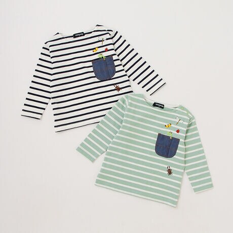 昆虫の刺しゅうを大集合させたボーダー柄の長袖Tシャツです。ダンガリーの胸ポケットに添えたモチーフが個性満点の雰囲気を演出。後ろにはさりげなく、カブト虫のステッチを飾りました。※80、90サイズのみ肩開き【リンク】お揃い品番:5131302【透け感】透けない【生地の厚さ】普通【伸縮性】あり【裏地】なし【ポケット】あり