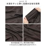 水滴をサッと弾く高撥水生地を使用。約100回洗濯しても、撥水効果が持続◎(※濡れた状態で放置することはお避けください。)