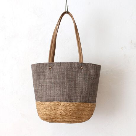 涼しげでナチュラルなデザインの、雑材ペーパーコンビトートが新登場。季節感のあるペーパー素材と異素材の組み合わせがポイント!底部分(ハカマ)は、かごバッグのような編み目デザイン。身体への負担がかかりにくい軽量設計。安心の内生地付き。開口部を巾着のようにキュッと絞れば、中身がこぼれ落ちる心配もなし◎内側は500mlペットボトルや長財布、コスメポーチなど、お出かけに必要な小物類が収まるサイズ感。オープンポケット×2付き。ショルダーは肩掛けしやすい長めのつくり。普段のお出かけや旅行などで大活躍!