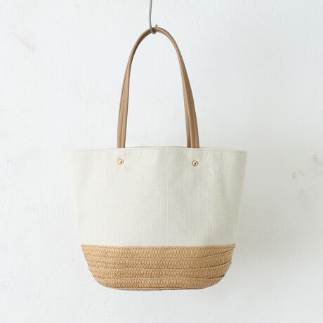 涼しげでナチュラルなデザインの、雑材ペーパーコンビトートが新登場。季節感のあるペーパー素材と異素材の組み合わせがポイント!底部分(ハカマ)は、かごバッグのような編み目デザイン。身体への負担がかかりにくい軽量設計。安心の内生地付き。開口部を巾着のようにキュッと絞れば、中身がこぼれ落ちる心配もなし◎内側は500mlペットボトルや長財布、コスメポーチなど、お出かけに必要な小物類が収まるサイズ感。オープンポケット×2付き。ショルダーは肩掛けしやすい長めのつくり。普段のお出かけや旅行などで大活躍!