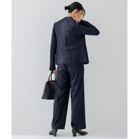 通勤やかしこまった場で活躍するノーカラージャケットです。前シリーズよりレングスを短めにし、ボトムスともバランスよく合わせられるようアップデートしました。同シリーズのパンツやスカートと合わせてセットアップでも、単品でボトムスをカジュアルにしても着られる着回し抜群ジャケットです。素材の軽さもあるので、前を開けて肩にかけてもさらっと着こなしやすいです。カラーは、女性らしく清潔感溢れるベージュ(#033)、大人上品なネイビー(#075)の2色展開です。