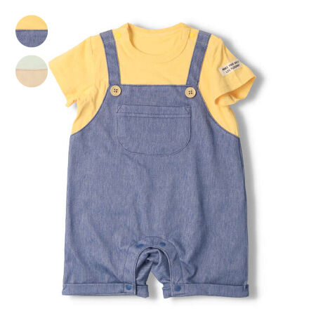 Tシャツに柔らか素材のサロペット、オーバーオール。1枚でコーディネートが楽しめる半袖Tオール、ロンパース。(股下のボタンで被りで着脱する仕様のオールになります。)【アイテム】プレゼント ギフト 赤ちゃん服 ベビー服 贈り物 トップス ボトムス つなぎ カジュアル お洒落 オシャレ かわいい 可愛い 普段着 デイリーウェア お出かけ着 ロンパース Tオール 子ども こども 男児 男の子 ボーイズ キッズ ベビーサイズ 幼稚園 保育園通園 2023年夏物新作 丸高衣料 イエロー 黄色 コン ネイビー 紺色 グリーン 緑色 ベージュ キッズズー コットン100% 綿100%