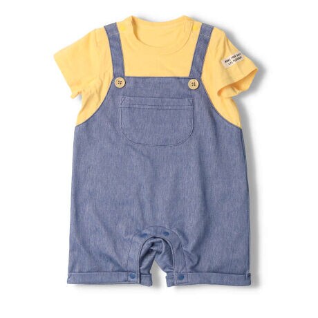 Tシャツに柔らか素材のサロペット、オーバーオール。1枚でコーディネートが楽しめる半袖Tオール、ロンパース。(股下のボタンで被りで着脱する仕様のオールになります。)【アイテム】プレゼント ギフト 赤ちゃん服 ベビー服 贈り物 トップス ボトムス つなぎ カジュアル お洒落 オシャレ かわいい 可愛い 普段着 デイリーウェア お出かけ着 ロンパース Tオール 子ども こども 男児 男の子 ボーイズ キッズ ベビーサイズ 幼稚園 保育園通園 2023年夏物新作 丸高衣料 イエロー 黄色 コン ネイビー 紺色 グリーン 緑色 ベージュ キッズズー コットン100% 綿100%