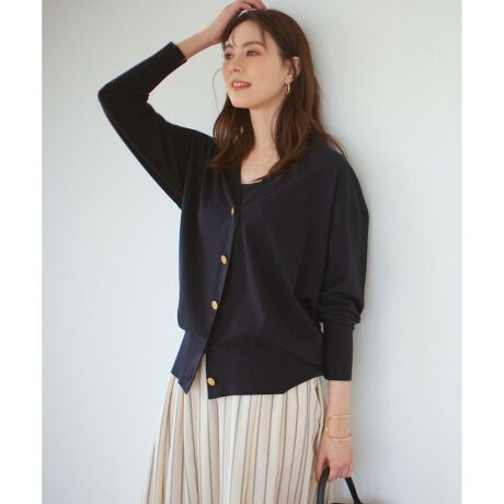 シンプルで使い易いベーシックなVネックカーディガン。体のラインを拾いづらい、ゆったりとしたシルエットです。ヒップが隠れるレングスで、細身のシルエットのパンツからボリュームのあるスカートまで、幅広くスタイリングを楽しんで頂けます。長袖シャツやカットソーとレイヤードさせても、もたつかない様に、アームホールのサイズは広めにとっています。襟周りは接ぎ目の無い見返し始末で、ソフトな印象に仕上げています。上品なツヤ消しゴールドの釦がアクセント。カラーは、合わせやすいネイビー(#075)やブラック(#005)に加え、柔らかい印象のベージュ(#033)、洒落感のあるブルー(#070)の4色展開です。