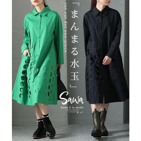 水玉模様のカッティングが大人モードにこなれるフレアワンピース。シャツのデザインのワンピースになっているため下部のボタンをあけていただき長めのチュニックとしてもオシャレで可愛く着こなしていただけます。シンプルながらもデザイン性があるので一枚着るだけでオシャレに見せてくれるのも魅力的。思いっきりモードに着こなしていただくのもカジュアルやガーリーに着こなしていただくのも◎色んなシーンでお使いいただけます。