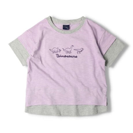 さりげない袖口や裾の重ね着風の配色デザインがお洒落!男の子に人気の恐竜の刺繍もポイントの半袖Tシャツ。(ベビーサイズのみ肩ボタン仕様になります。)【アイテム】トップス カジュアル お洒落 オシャレ かっこいい かわいい 可愛い 普段着 デイリーウェア お出かけ着 お外着 お外遊び着 子ども服 こども服 男児 男の子 ボーイズ キッズ ベビーサイズ トドラーサイズ 幼稚園 保育園 小学校 通園 通学 小学生 2023年夏物新作 丸高衣料 半袖 パープル 紫色 ラベンダー サックス ブルー 水色 青色 ダイナソー クレセント
