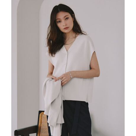 ■デザインフロントの釦ディテールがポイントのスリーブレスプルオーバーです。釦を全て開けたらジレ風に、また前後着用も可能なのでマルチウェイな着こなしを楽しめます。ネックラインはシンプルに、脇ライン先に入ったスリットなどさり気ないディテールが光ります。同素材のニットパンツやニットジャケットと合わせてセットアップでの着用がおすすめです。