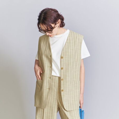 メンズライクな雰囲気の4つボタンがアクセントを効かせる、ストライプ調ツイード素材のベスト。