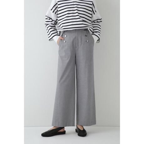 【デザインポイント】ボタンディテールのマリンパンツ風デザインは、腰回りをすっきりと仕立てて目線を上にあげる効果もあります。裾に向かってややフレアーになるシルエットのセミワイドパンツは足長効果も狙えます。