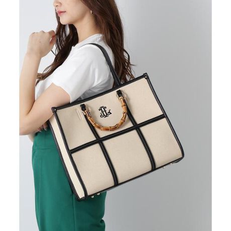 エンブレム刺しゅうがポイントのトートバッグ。上品なバンブーハンドル&肩掛けできる長さの合皮ハンドル付き。マチがあり必需品がしっかり入れられるサイズ感です。底びょう付きで自立しやすく、デイリースタイルにおすすめ。※撮影時照明の関係により、色味が違って見える場合がございます。またパソコン・スマートフォンなどの環境により、若干製品と画像のカラーが異なる場合もございます。予めご了承ください。商品の色味は、商品単品画像をご参照下さい。※商品画像はサンプルのため、色味やサイズ等の仕様に変更がある場合がございますので、予めご了承ください。