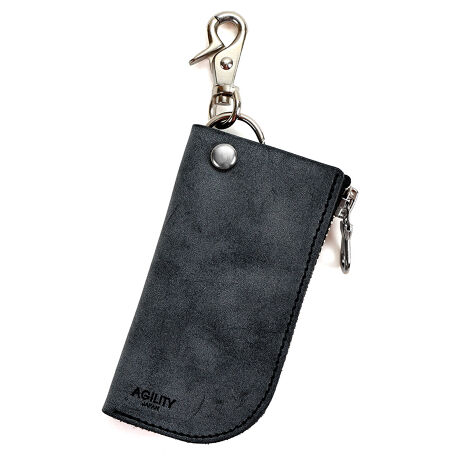 『鍵を入れる鞘』というイメージからデザインした、刀の鞘の形をしたキーケースです。本体ファスナーを開けると、中にキーリングが1つ、キーフックが3つ付いています。ノーマルな鍵が3本と、車のリモコンキーを1つ取り付けることができます。鍵を使用しないときは本体の中に収納でき、よく使う鍵だけを外に出してファスナーを閉めることも可能です。上部にフック式ナスカンが付いているので、バッグの金具やパンツのベルトホールに取り付けてお使いいただけます。