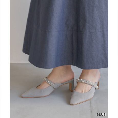 ベルトにパールを施したニットミュールパンプス
