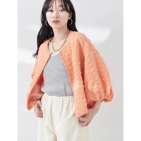ぽこぽことした生地が可愛らしいノーカラーブルゾン。