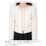 2着目のジャケットはワンピースのスカート部分と同素材の、滑らかなドビー生地が美しいノーカラージャケットです。