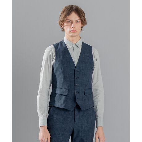 ベーシック、ジャケットイン型ジレ。フロント5ボタン、腰ポケット:フラップ、バックベルト(ボタン調整)。裏地無し。ウエストシェイプの効いたスッキリシルエット。