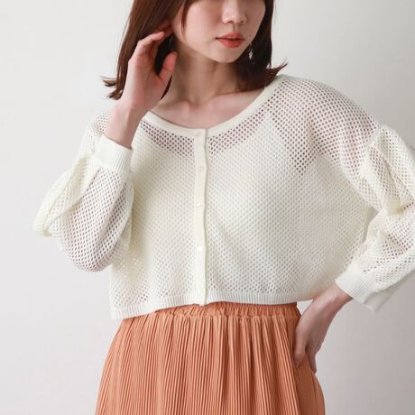 メッシュ編みボリュームスリーブニットカーディガン
