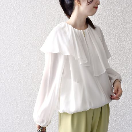 ・アシンメトリーのケープ風フリルが1枚で着映えするブルゾン。
