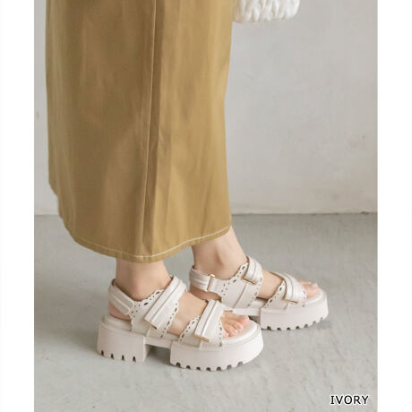 フェミニンムード漂うカットワークデザインのボリュームソールサンダル
