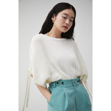 2023 Spring&Summer item ・コットンの様に肌当たりの良い風合いが特徴の糸を使用し、中心部からリブのピッチを変えて編んでいます。 ・ポリエステルの発色の良さも特徴です。 ・ボートネックとVネックと2WAYで着用できるデザインドルマンニットです。 ・袖のレースアップが腕の動きを美しく見せてくれます。 ・鎖骨が綺麗にみえるネックラインと脇にかけて細くなるリブ編みで細見え効果があります。