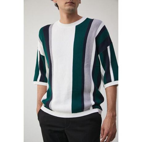 2023 Spring&Summer item ・綿混の糸を使用し、ガーター組織で編み立てた素材です。 ・編地を横向きに使用し、マルチストライプカラーを表現したニットです。 ・昨年大人気の5分袖マルチカラーガーターニットです。 ・コットン、アクリルなので毛玉になりづらく、洗濯機で洗えるのもポイントです。 ・ジャケットのインナー、トラウザーなどときれい目なコーディネートにおすすめです。