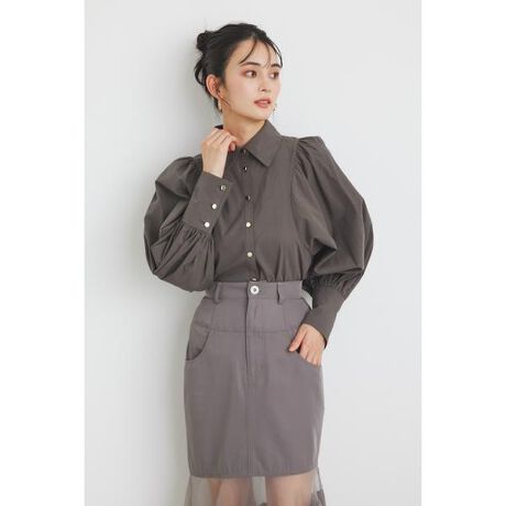 【ボリュームスリーブが可愛い新色をプラスしたデザインブラウス】【Design】一際目を惹くキャンディーのようなボリュームスリーブがポイントのブラウス。袖のボリュームと相反した身頃のコンパクトさのバランス感を計算し、大人フェミニンの風合いに仕上げました。ボリューム袖が可愛い印象を与えるので、素材は張り感のある生地を選び、前立ての身頃と同色のボタン付属することでよりシックなイメージにしました。ブラウスはインでもアウトコーデでも着用しやすいようにデザインなので1つあれば万能なアイテムです。【Color】どんなアイテムにもマッチしやすいWHTに、シックで上品な雰囲気を放つGRY、優しく柔らかいイメージを与えるL/PURとL/BLUの4色展開です。