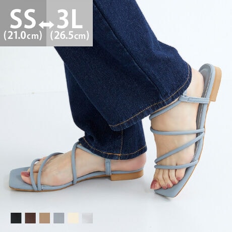 足の甲に対し斜めに流れるストラップ使いが女性らしいスクエアトゥサンダル。