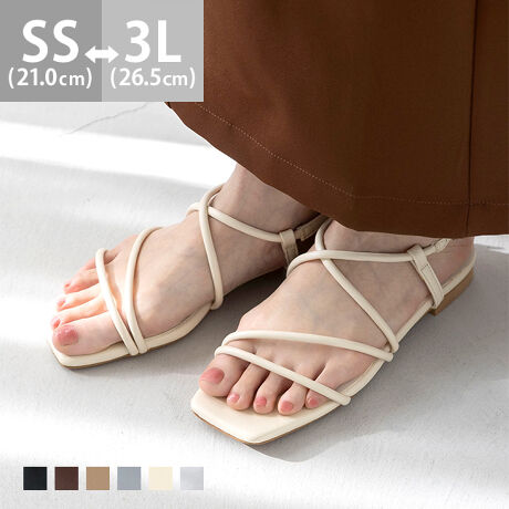 足の甲に対し斜めに流れるストラップ使いが女性らしいスクエアトゥサンダル。