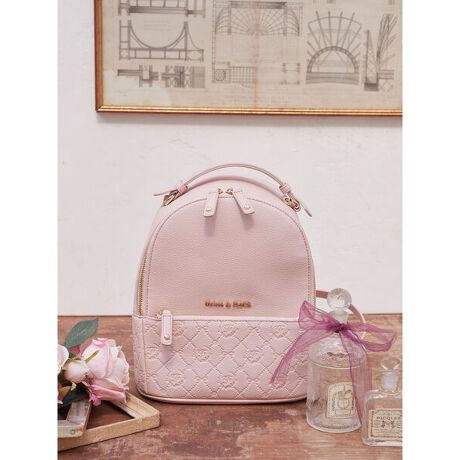 前面ポケットにオリジナルのモノグラムを型押ししたクラシカルなリュック。 リボンやバラのモチーフをデザインに落とし込んだ、大人可愛いアイテムです◎ 高級感のあるフェイクレザーとゴールドの金具で上品に仕上げました。 コンパクトな見た目ながら、500mlのペットボトルもしっかり入る大容量なサイズ感です。 内側にもファスナーポケットがついていて、貴重品などの小物を入れることができます。 メイン収納は両開きファスナーで、荷物の出し入れがしやすいのも嬉しいポイント。 ショルダー部分は取り外しできるので、持ち方の変化も楽しめるデザインです。 キレイめからカジュアルまで幅広いコーディネートに合わせられるおすすめのアイテムです。