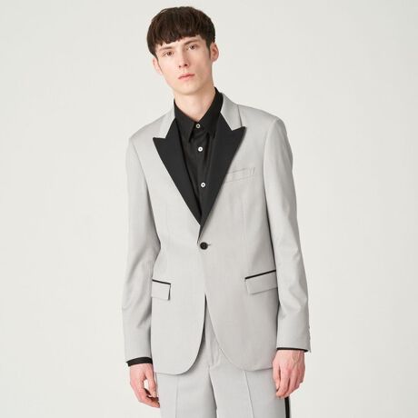 サテン切り替えが特徴のピークドラペルジャケット