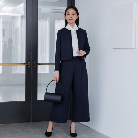ジャケットとワイドパンツは同素材で仕立てています。