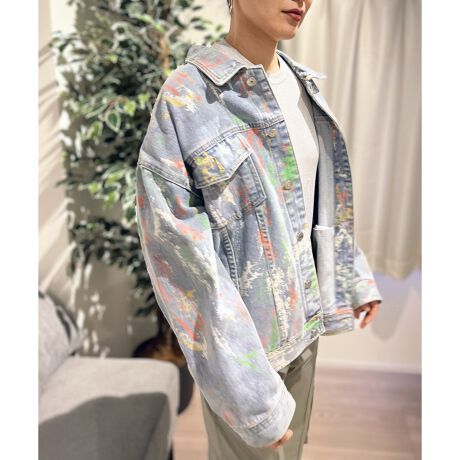 インクを飛ばしたようなペイント加工を施したオーバーサイズのデニムジャケット*