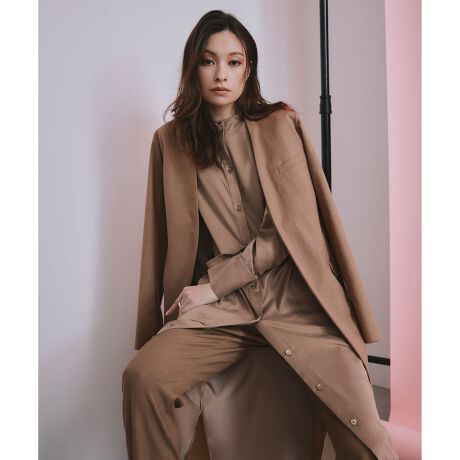 ■デザインすっきりとシャープな印象のノーカラージャケット。ドレスライクな印象ながら、ボトムを選ばずさらっと羽織って頂けるデザインです。通常のジャケットよりも肩に重さがかからないよう計算されたフリーアーム設計のため、腕の動きを阻害しないストレスフリーな着心地になっています。外袖にのみ裏地を付けており、着脱もスムーズです。同シリーズのボトムとのセットアップ着用が可能で、パンツはもちろん、スカートとも相性良く合わせていただけます。