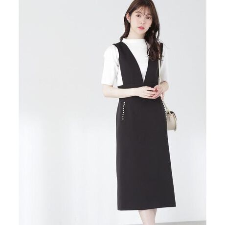 【商品特徴】上身頃のVカットラインが、キレイで大人顔なジャンパースカート。ウエスト部分は、ハイウエストで切り替えているため、腰の位置を高く見せてくれます。ポケット口にあしらったパールパーツが上品なポイントです。【スタイリング】ブラウスからニットプルオーバーまでレイヤードスタイルを楽しめます。