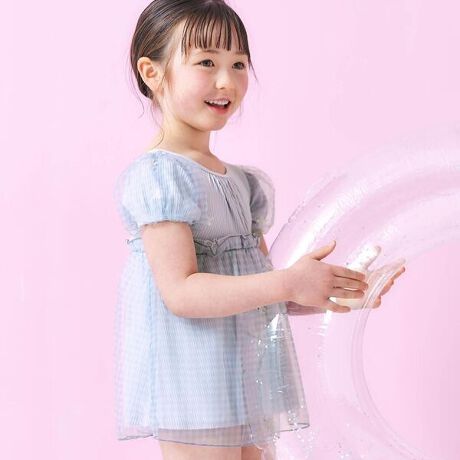 【apres les cours◎swim collection】トップス部分はテレコ素材で袖部分にはチュールを重ねています。袖のチュールにはお花のモチーフがついていて、水着とは思えないゴージャスでおしゃれなデザインの水着です♪リブ素材を使っているのでお洋服のような雰囲気にみえるのがポイント。スカート部分はリブ素材とチュール素材を重ねているので透け感も気にせず着ていただけます♪