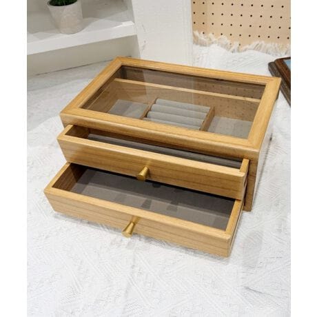 木製がナチュラルでお洒落なジュエリーボックス。 コンパクトなのに大容量◎ ネックレス・ブレスレット・ピアス・カギなどお持ちのアクセサリーの収納・保管にご利用いただけます☆ 中身の見える全面ガラスでお気に入りの アクセサリーやジュエリーをディスプレイしたくなります☆ 多くの光を取り込んでくれてアクセサリーも より一層輝いて綺麗に見えます。 そのままインテリアとして飾るのもおすすめ。 素敵な雰囲気になります☆ 玄関先やお化粧ドレッサー、インテリア小物を置いているスペースなど お好みの一角にぜひおしゃれな見せる収納としてお使いください☆ 置いてあるだけでお洒落なアイテムです。