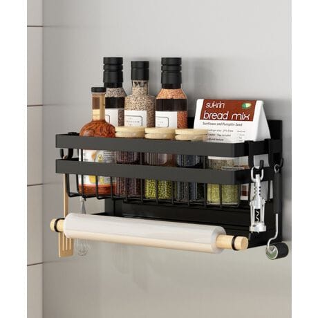 二層設計の冷蔵庫サイドラックとして使用できます。キッチンペーパーホルダーや香味料入れ飲み物の保管と整理に最適です。