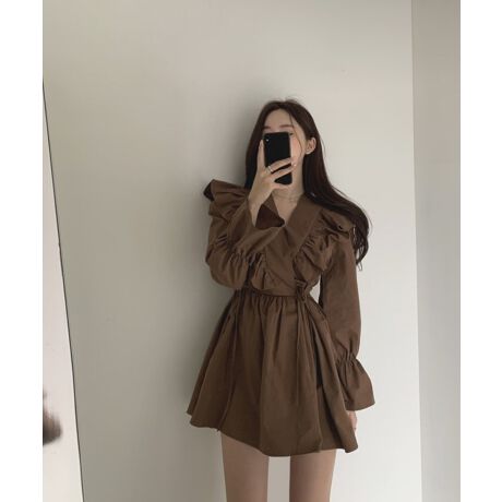 大きなフリルが印象的なキュートなフリルミニワンピース Vネックなので顔周りをスッキリみせてくれます 今はやりのロングブーツと合わせるのも