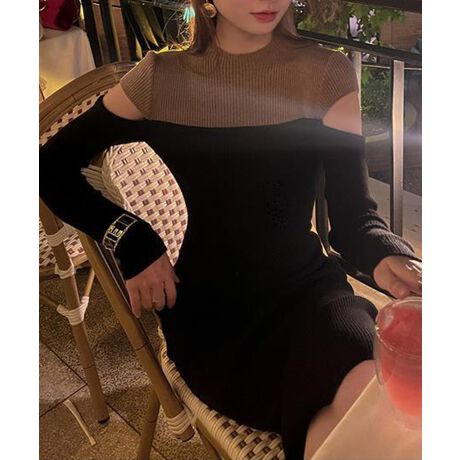 【Jasmine】2トーンカラー肩開きニットロングワンピース