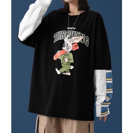 【HOOK】【人気アイテム】重ね着風長袖tシャツ フロントプリント入り