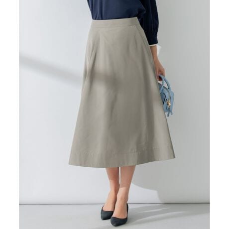 ■デザインややのぼらせたウェストですっきりとした腰まわりと長めの着丈感が女性らしい印象の美しいシルエットのフレアスカート。タテラインに切り替えを入れ、裾にかけて広がりのあるシルエットにしています。広めにとった裾の切り替えがシンプルなデザインのアクセントになっています。後ろウエストは部分的にゴム仕様にしているので着心地の良さも嬉しいポイントです。