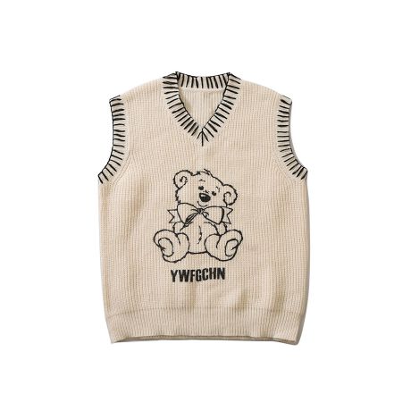 【HOOK】クマプリント手縫い巻きかがり風ニットベスト